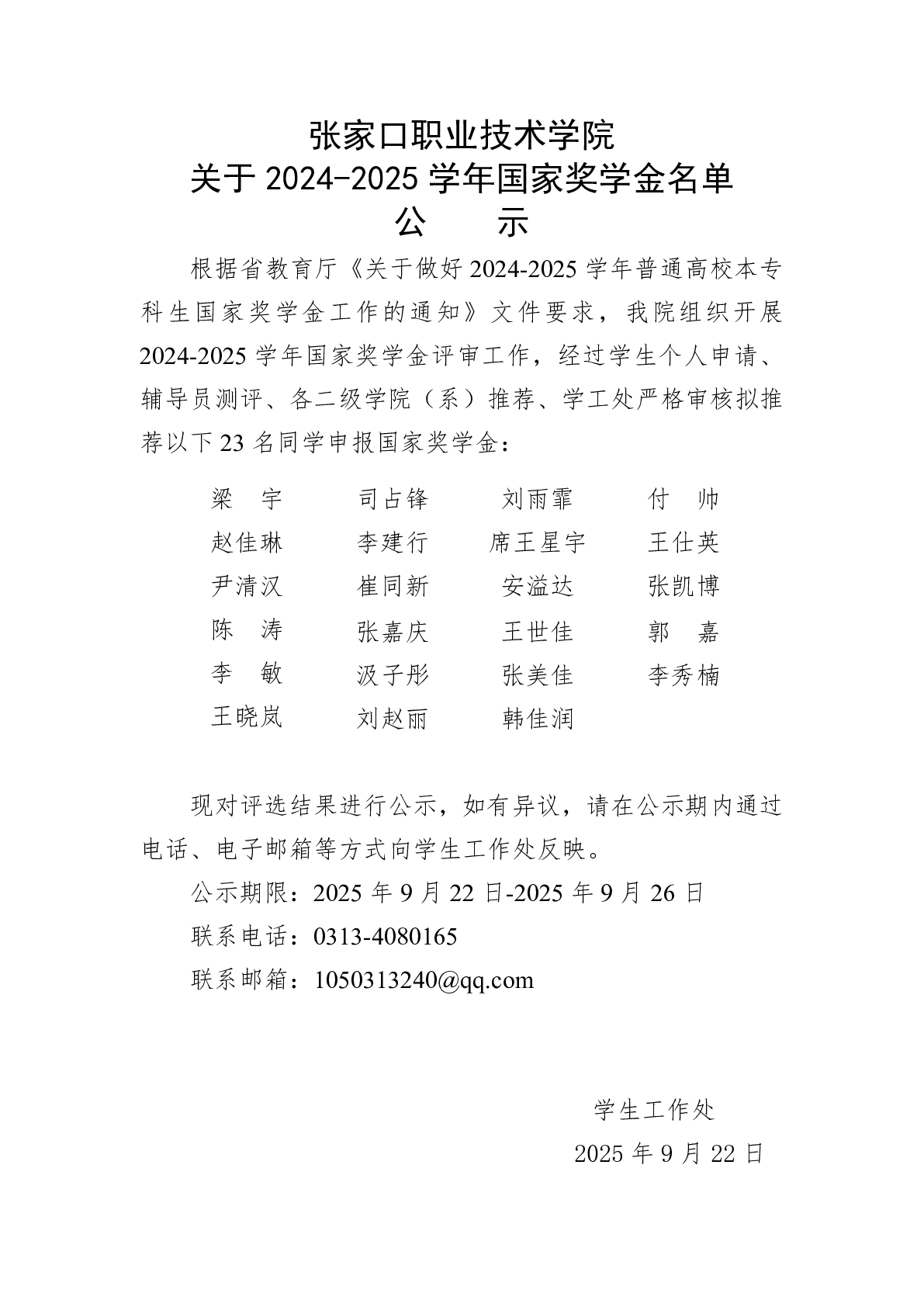 张家口职业技术学院 关于2024-2025学年国家奖学金名单公示