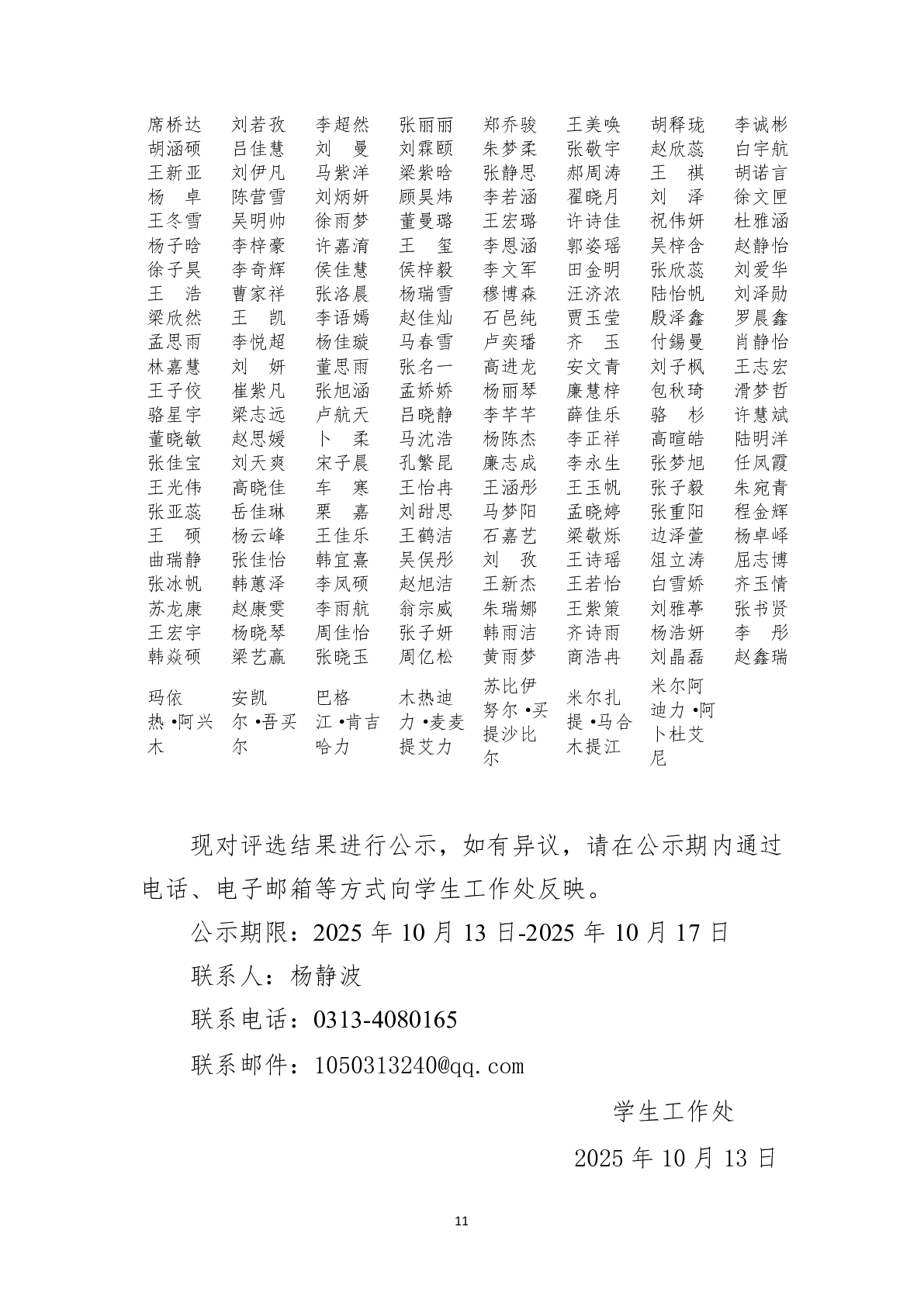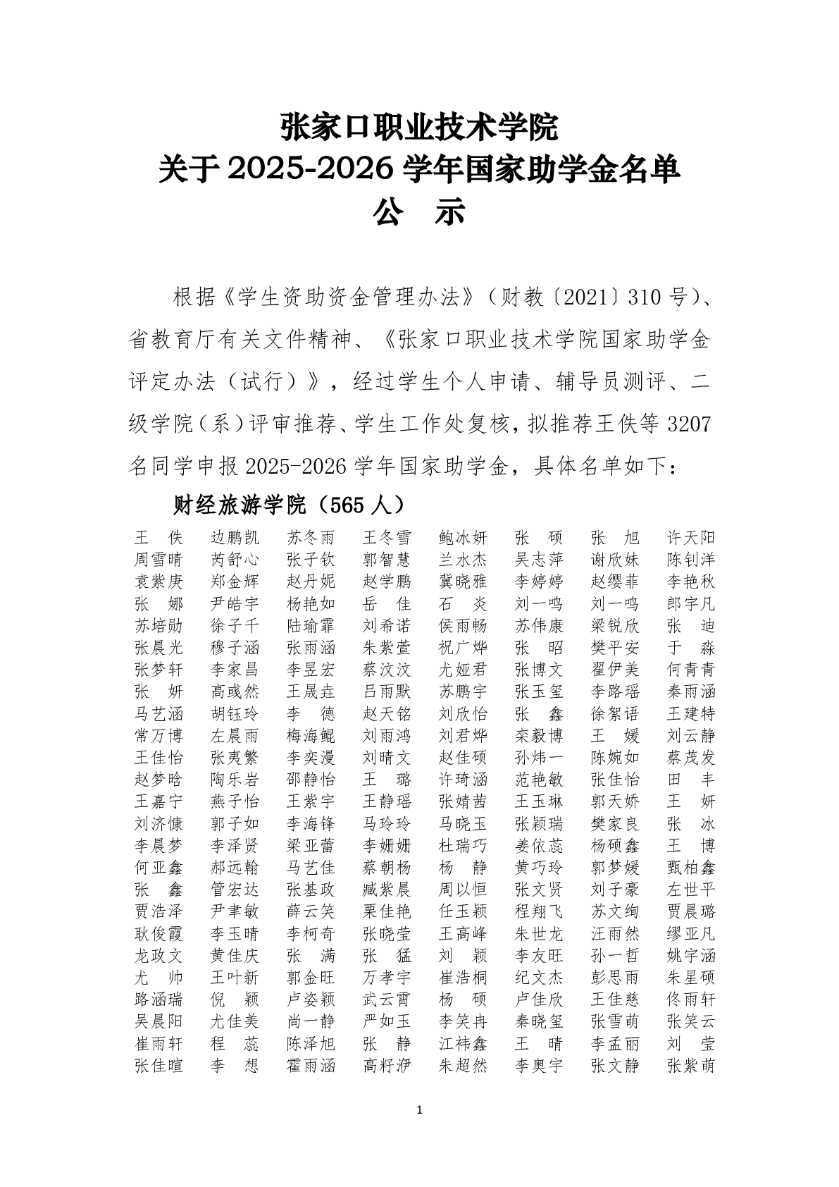张家口职业技术学院 关于2025-2026学年国家助学金名单公示
